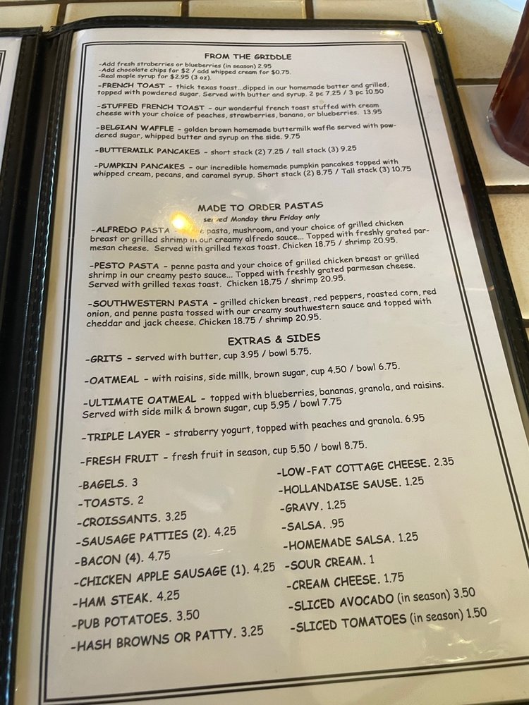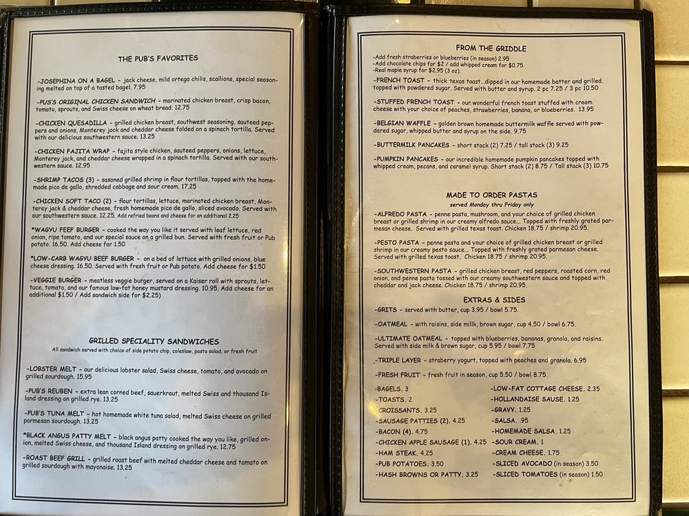 Two eggs with choice of Pub Potatoes, Hash Brown, or Hash Brown Patties. Toast options: Texas Toast, English Muffin, Bagel with Butter or Cream Cheese, Croissants.